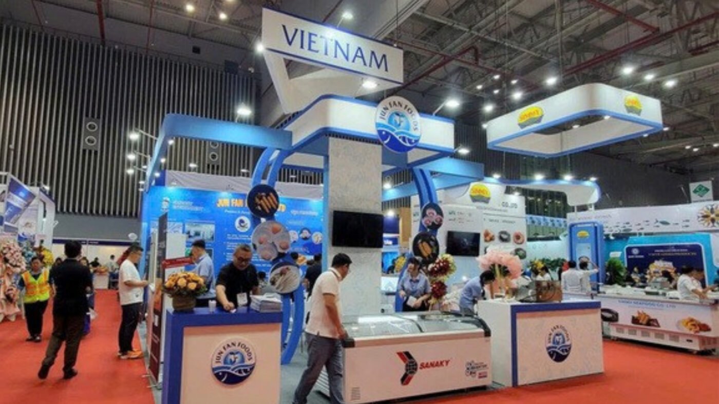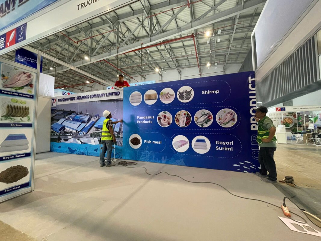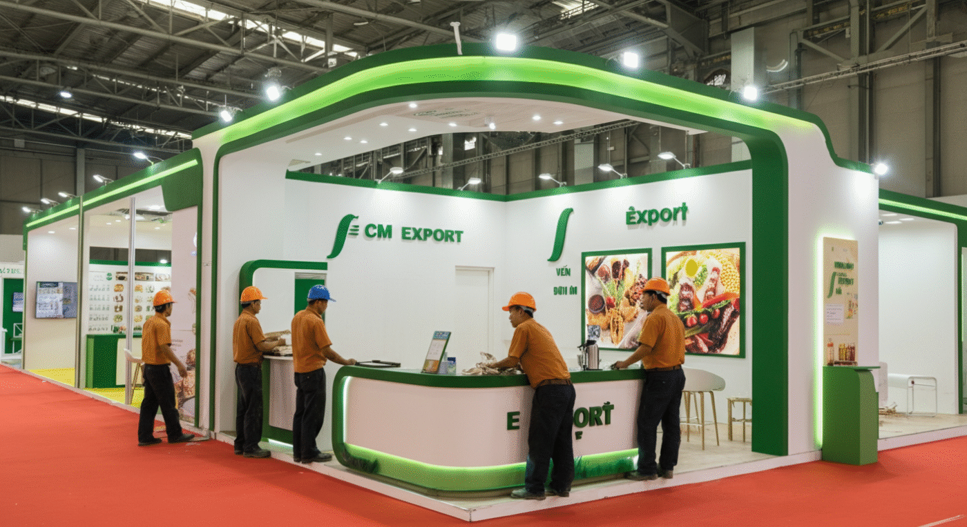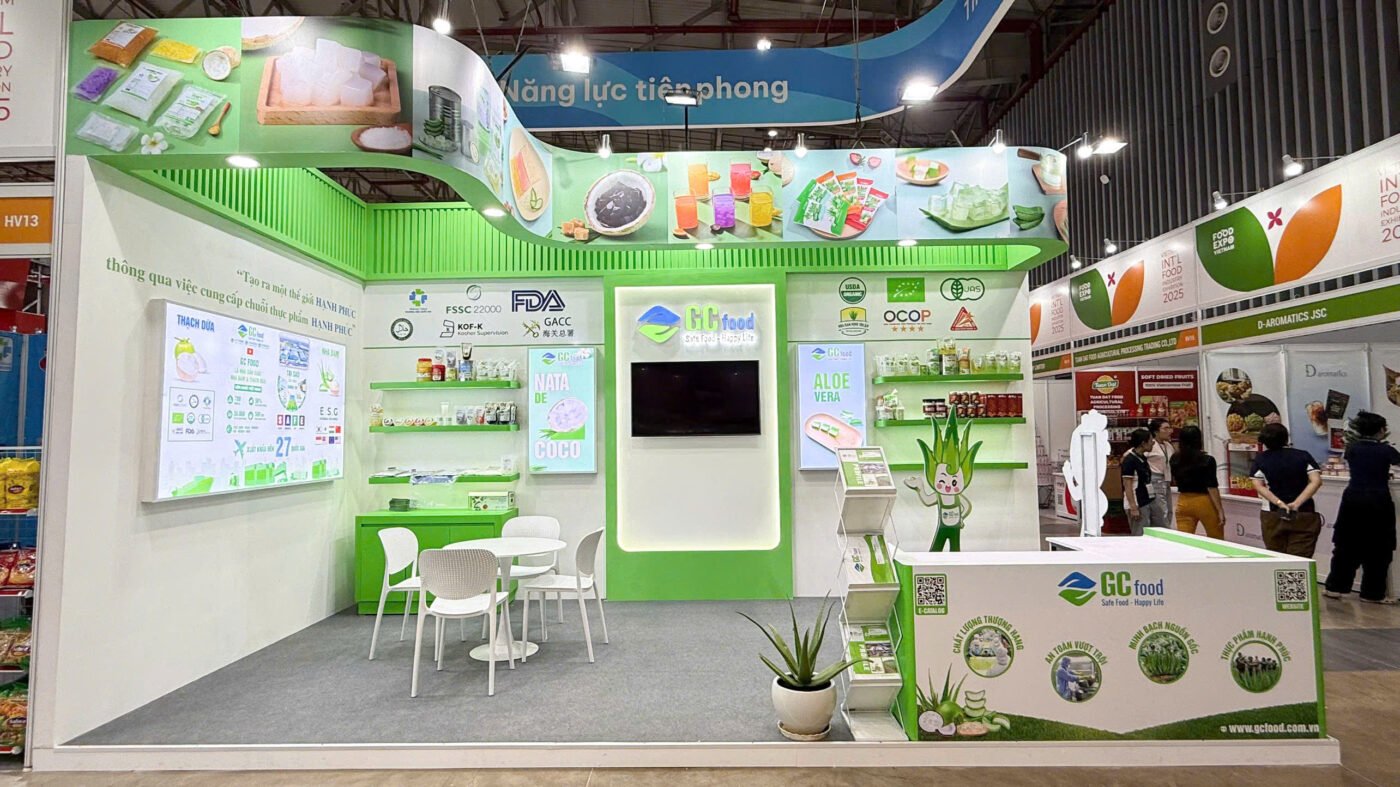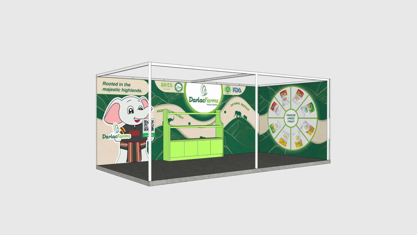 Gian hàng 18m2 (6x3m) với phương án vách MDF sơn nước kết hợp bố trí nhiều đèn giúp gian hàng vô cùng sáng sủa và bắt mắt. Đặc biệt chất lượng thi công ngoài thực tế chính xác đến 90% so với bản vẽ 3D. Gian hàng phù hợp cho mọi đơn vị doanh nghiệp trưng bày hàng hóa, sản phẩm trong các triển lãm như Food Expo, Sourcing Expo,…