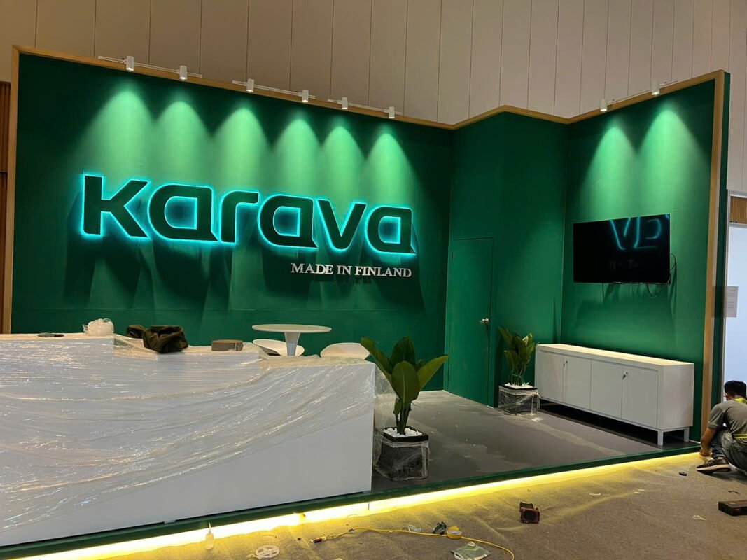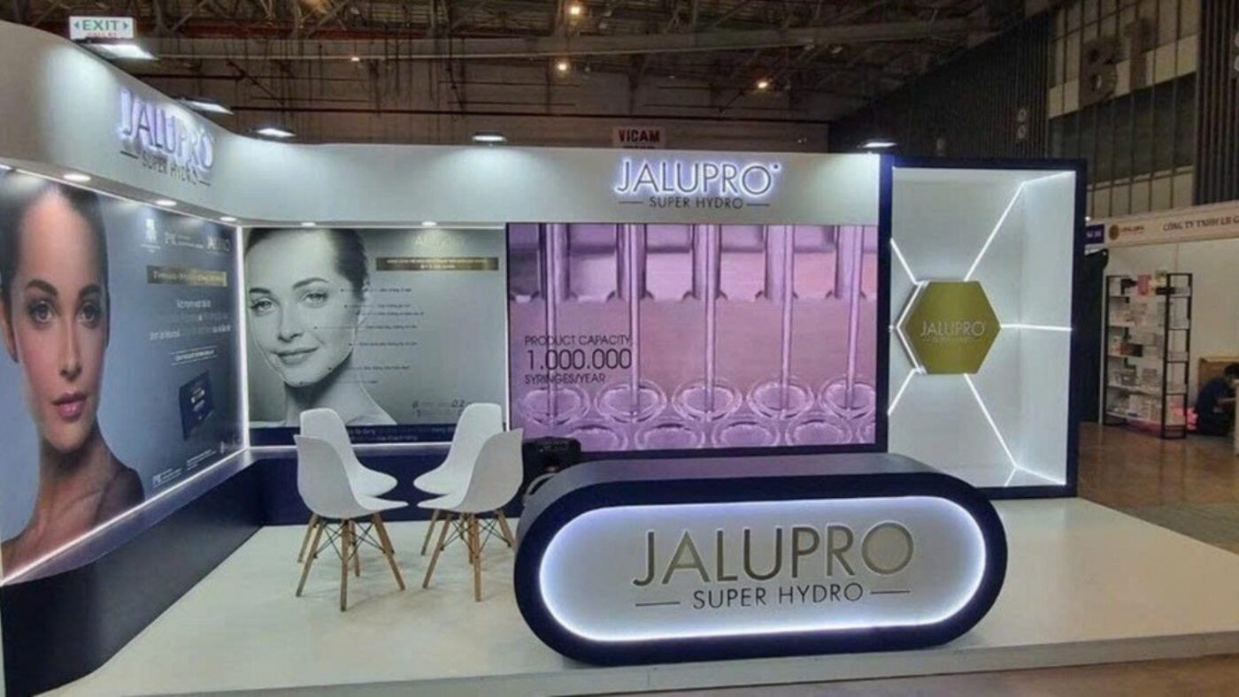 Gian hàng tiêu chuẩn (gian hàng cơ bản) dán decal các vách, phương án thi công gian hàng tiết kiệm tuy nhiên điểm yếu là hình ảnh gian sẽ bị ngăn cách, chất lượng về mặt thẩm mỹ sẽ phụ thuộc rất nhiều vào thiết kế 2D
