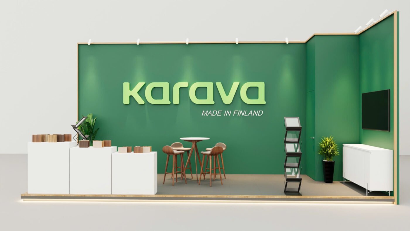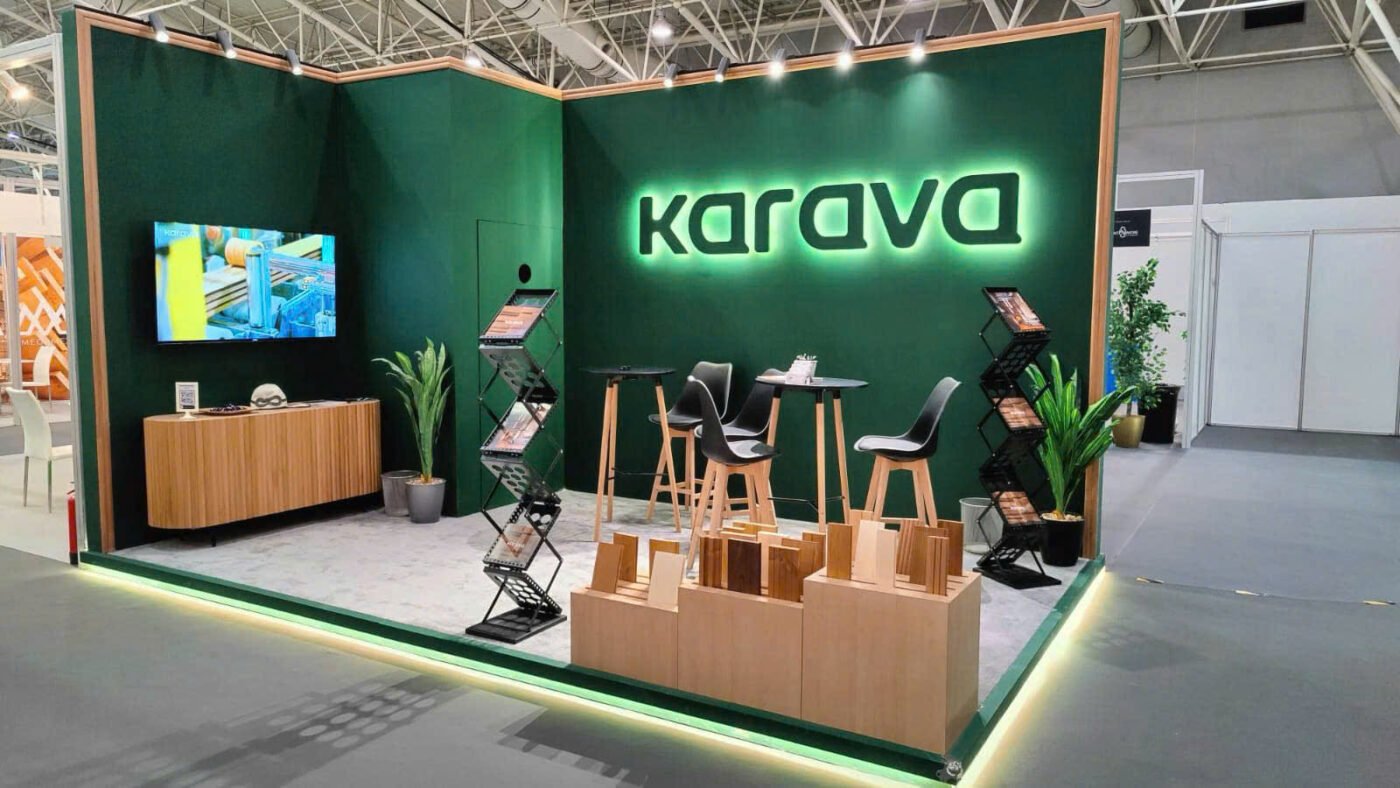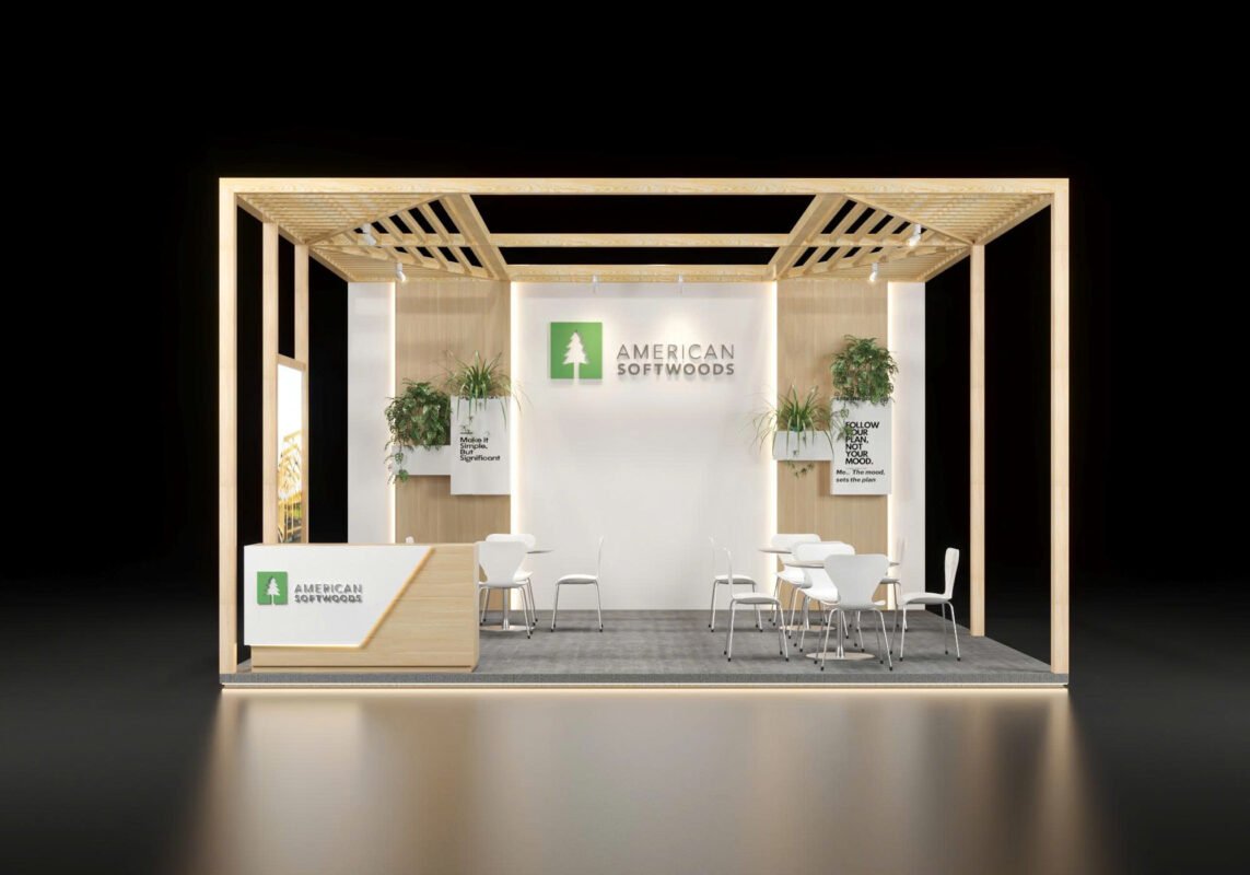 Gian hàng 18m2 (6×3) 2 mặt mở phù hợp cho doanh nghiệp về gỗ, đồ nội thất,…với thiết kế sáng tạo, phá cách, ấn tượng